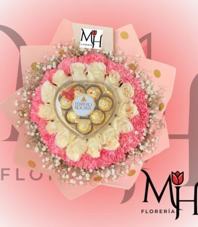 Romántico ramo 45 rosas con ferrero rocher 100g