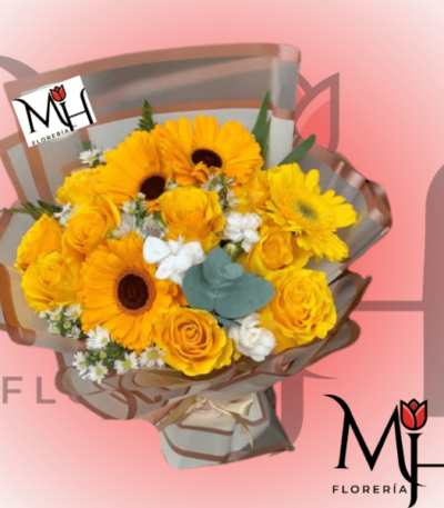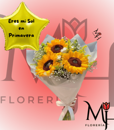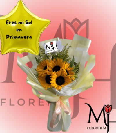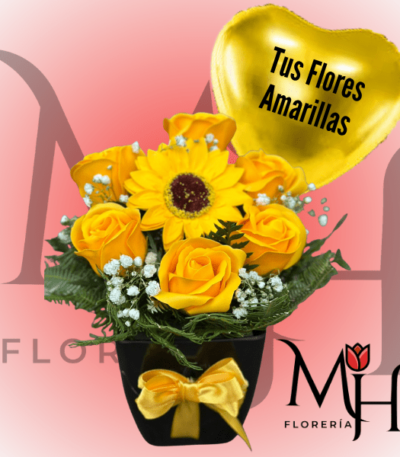 Arreglo de 6 Rosas amarillas con 1 Girasol jabón, follaje y Globo