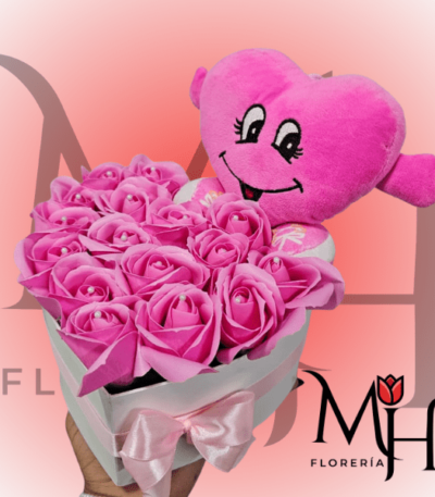 CAJA CORAZON 15 ROSAS JABON Y PELUCHE CORAZON