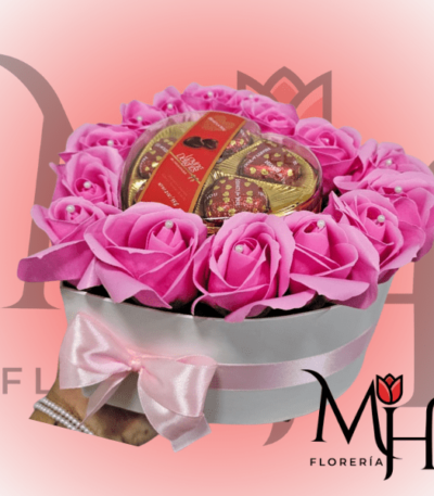 BOX DE 15 ROSAS JABON Y BOMBONES CORAZON