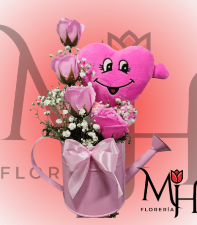 JARDINERA CON 4 ROSAS JABON Y PELUCHE CORAZON