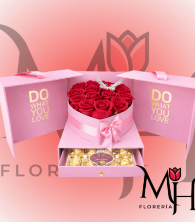CAJA CORAZON CAJONERA ROSE : ROSAS DE JABON + BOMBONES VALENTTE