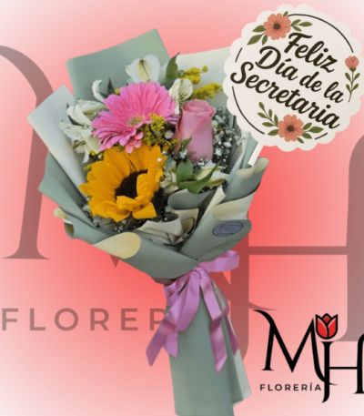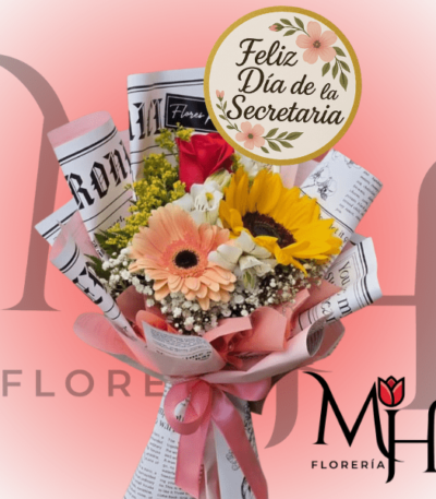 PARA LA SECRETARIA RAMO 1 ROSA 1 GIRASOL 1 GERBERA Y TOPPER