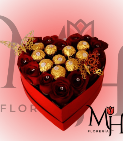 CAJA CORAZON CON 15 ROSAS 10 BOMBONES