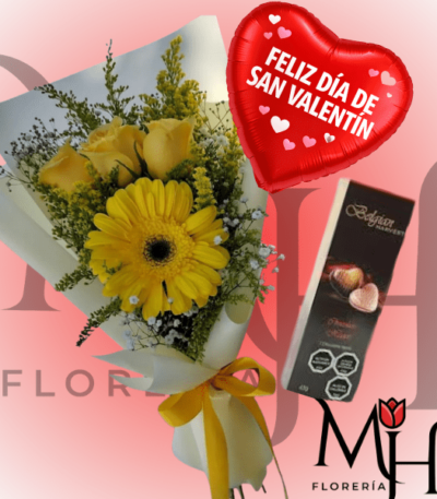 LINDO DETALLE PARA EL DIA DEL AMOR Y LA AMISTAD 3 ROSAS 1 GERBERA GLOBO Y BELGIAN