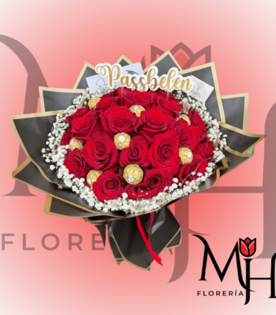 PRECIOSO RAMO DE 15 ROSAS 6 BOMBONES Y TOPPER