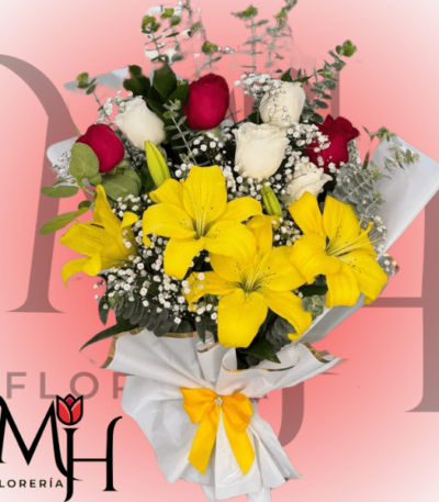 Ramo de 7 rosas, 5 Lilium y follaje