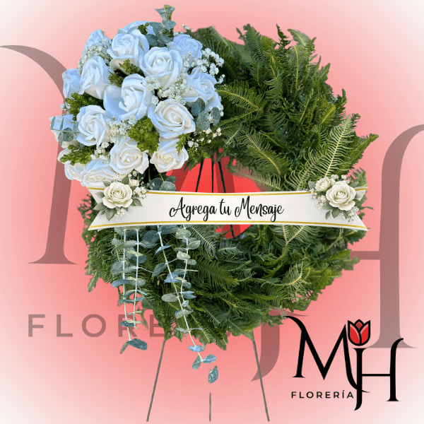 CORONA 50 CM CON BOUQUET DE 20 ROSAS ETERNAS CINTA Y ATRIL