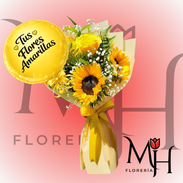 RAMO FLORAL 2 ROSAS 2 GIRASOLES GLOBO DIA DE LAS FLORES AMARILLAS
