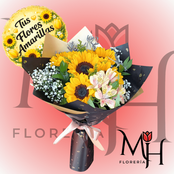 RAMO FLORAL DE 5 GIRASOLES Y GLOBITO