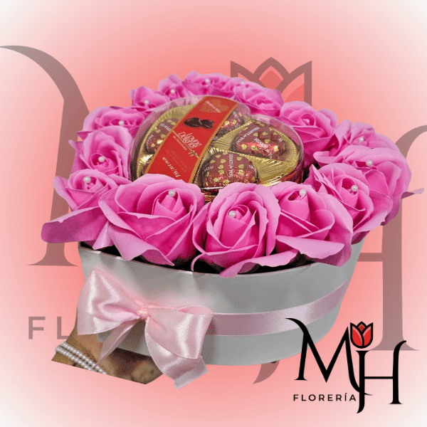 BOX DE 15 ROSAS JABON Y BOMBONES CORAZON