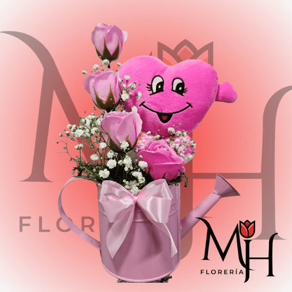JARDINERA CON 4 ROSAS JABON Y PELUCHE CORAZON