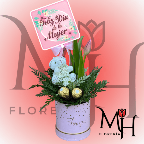BOX 2 BOMBONES 2 TULIPANES 1 PELUCHITO 11CM Y TOPPER