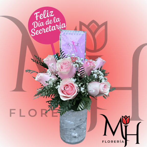ARREGLO PARA EL DIA DE LA SECRETARIA CON 8 ROSAS ACCESORIO Y TOPPER