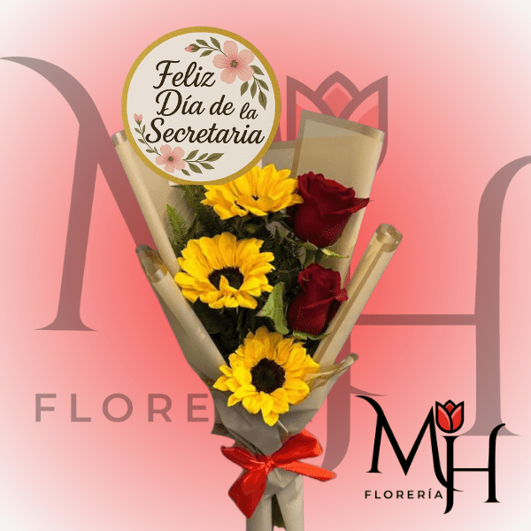 RAMO FLORAL PARA EL DIA DE LA SECRETARIA 3 GIRASOLES 2 Y TOPPER