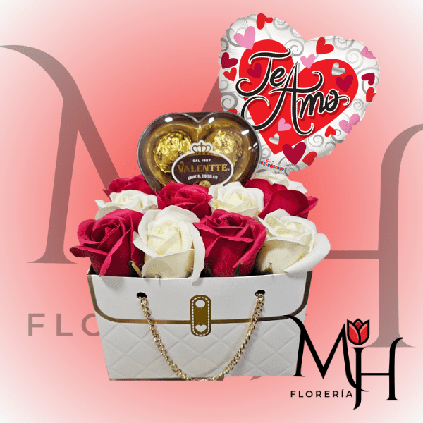 CARTERA DE 12 ROSAS DE JABON, BOMBONES VALLENTE Y GLOBITO