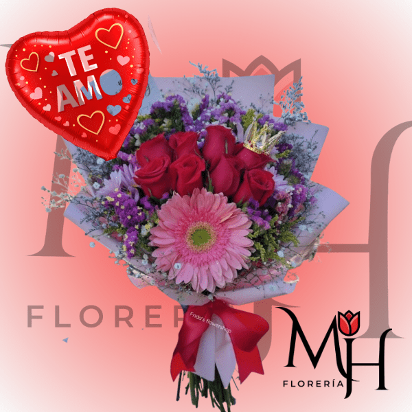 RAMO 8 ROSAS 1 GERBERA GLOBO Y CORONA