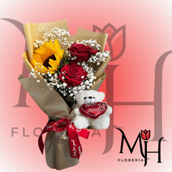 RAMO DE 1 GIRASOL 2 ROSAS Y PELUCHITO 11 CM