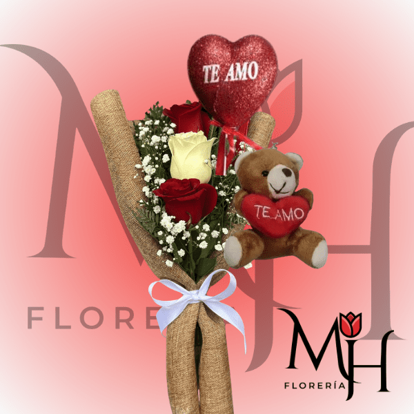 RAMO LOVE DE 3 ROSAS, PELUCHITO LLAVERO Y TOPPER TE AMO