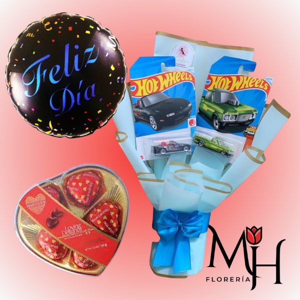 Envio de 2 Carrito Hot Wheels a Domicilio Con Bombones Corazon de 5 Und y Globo