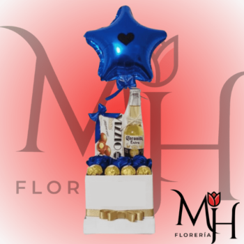 Box de 3 rosas azules naturales, 4 bombones ferreros Rocher, 1 cerveza, 1 bombón Vizzio y globo
