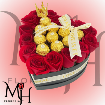 Caja corazón de 15 rosas, 9 bombones ferreros rocher y coronita
