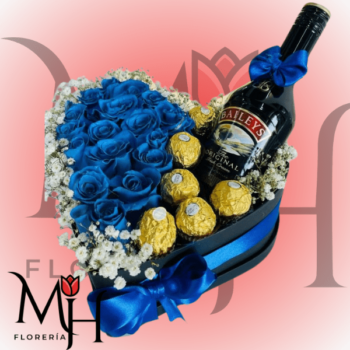 Caja corazón de 16 rosas azules, 6 bombones, botella de Baileys y gypsophila