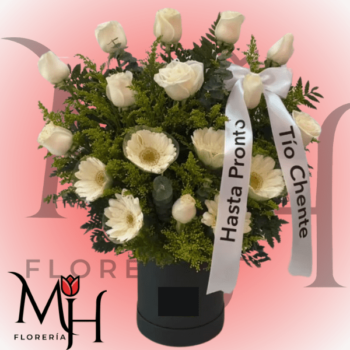Box Fúnebre de 12 Rosas, 6 gerberas, follaje y Cinta