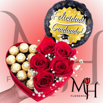 Caja corazón 5 Rosas importadas, 12 bombones ferreros Rocher y globo