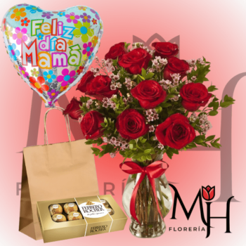 Florero samaritano 12 rosas ferreros de 100g y globo