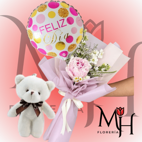 LINDO DETALLE 1 PEONIA + LLAVERO Y GLOBO
